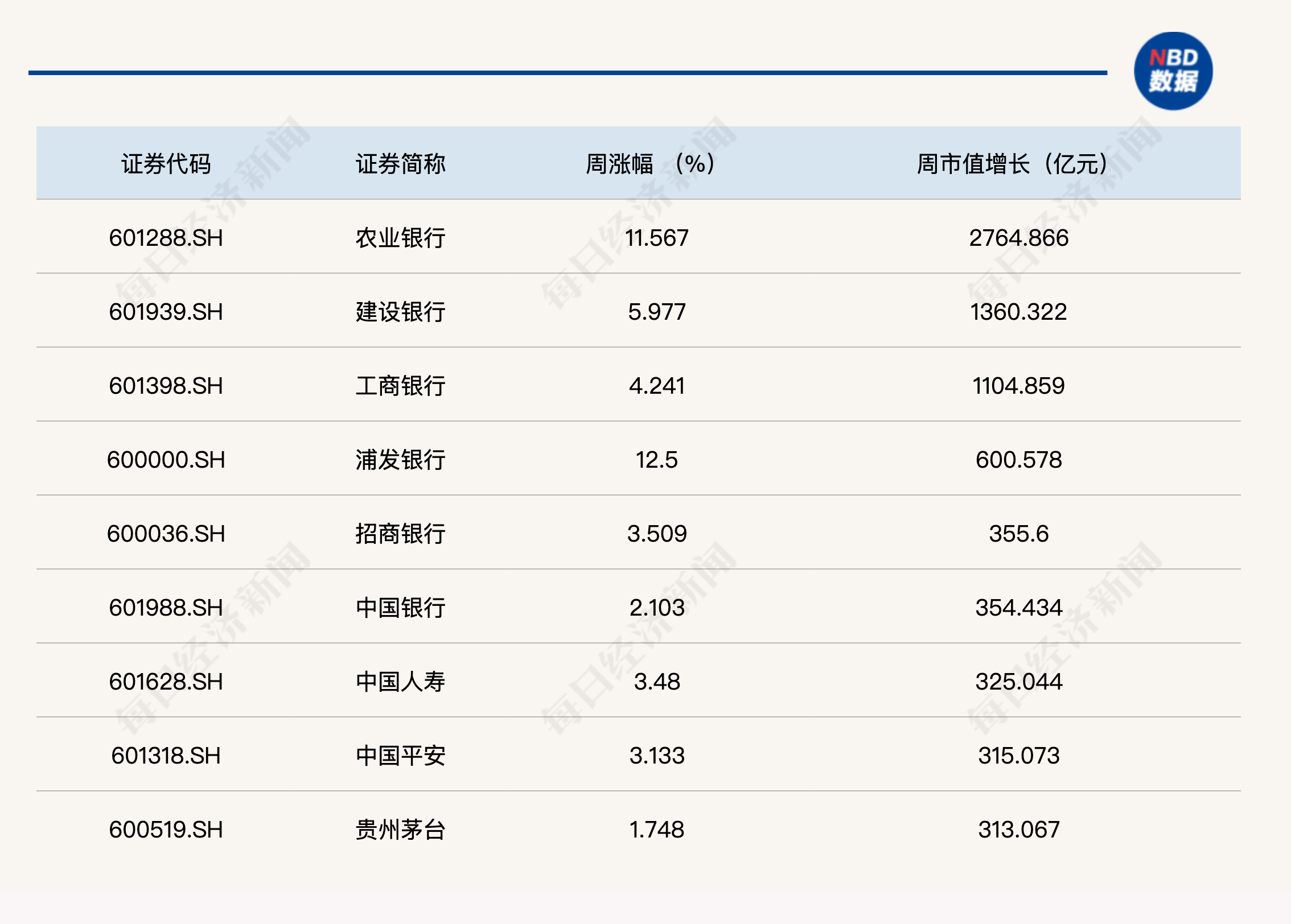 周市值增长方面,农业银行周市值增长高达2764.87亿元,建设银行和工商银行周市值增长也分别达到1360.32亿元和1104.86亿元。