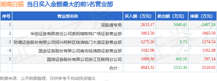 证券之星消息,沪深交易所2025年10月20日公布的交易公开信息显示,湖南白银(002716)因日跌幅偏离值达到7%的前5只证券登上龙虎榜。此次是近5个交易日内第1次上榜。