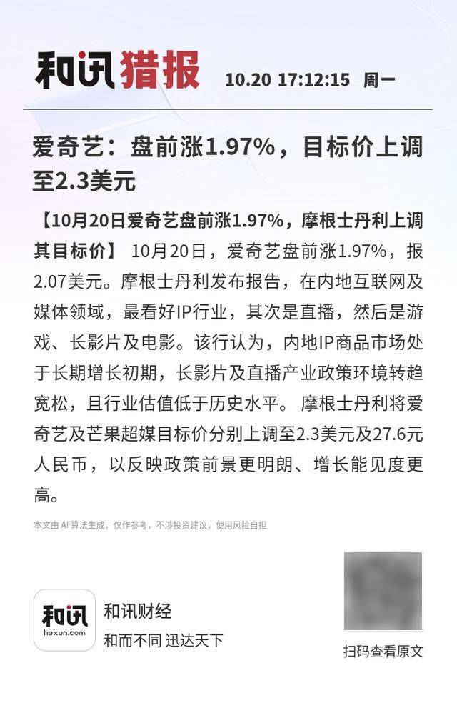 【10月20日爱奇艺盘前涨1.97%,摩根士丹利上调其目标价】10月20日,爱奇艺盘前涨1.97%,报2.07美元。摩根士丹利发布报告,在内地互联网及媒体领域,最看好IP行业,其次是直播,然后是游戏、长影片及电影。该行认为,内地IP商品市场处于长期增长初期,长影片及直播产业政策环境转趋宽松,且行业估值低于历史水平。 摩根士丹利将爱奇艺及芒果超媒目标价分别上调至2.3美元及27.6元人民币,以反映政策前景更明朗、增长能见度更高。