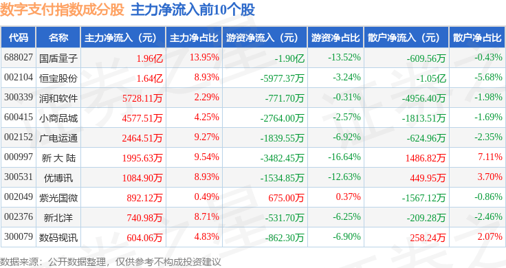 资金流向方面,数字支付(980113)指数成份股当日主力资金净流出合计1.84亿元,游资资金净流出合计4.68亿元,散户资金净流入合计6.52亿元。成份股资金流向详情见下表: