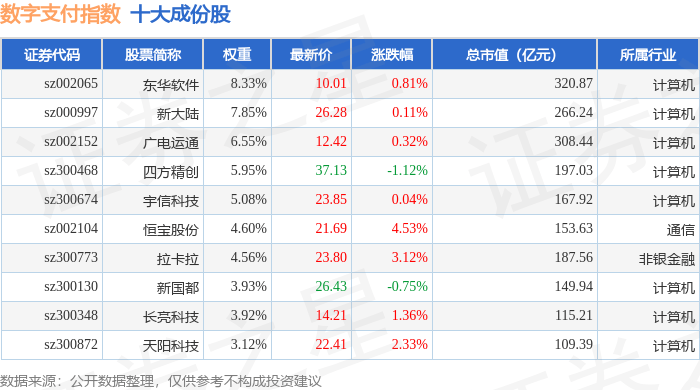 证券之星消息,10月20日,数字支付(980113)指数报收于1836.62点,涨1.14%,成交205.62亿元,换手率1.96%。当日该指数成份股中,上涨的有45家,恒宝股份以4.53%的涨幅领涨,下跌的有4家,四方精创以1.12%的跌幅领跌。