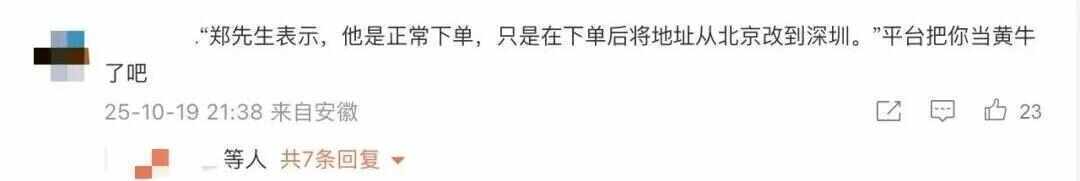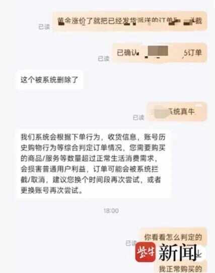 “我首先联系了商家客服,商家回应称自己没有权限取消订单,需联系平台的客服问下情况。”郑先生说,他随即去咨询了平台客服,对方表示郑先生的订单“被系统拦截了”,并告知郑先生:系统会根据下单行为、收货信息、账号、购物历史行为综合判定订单情况,若需要购买的商品/服务等数量超过正常生活消费需求,会损害普通用户利益,订单可能会被系统拦截/取消。客服建议郑先生换个时间段或更换账号再次尝试。郑先生表示,他是正常下单,只是在下单后将地址从北京改到深圳。