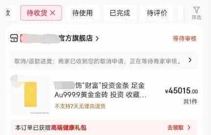 郑先生告诉记者,10月10日,他在某平台一家首饰官方旗舰店以900.3元的克价购买了一块50克的金条,共支付了45015元。由于当时金价有所上涨,郑先生在没收到货的情况下,提前以最新的市价将这块金条卖出。然而10月11日下午,正当订单显示“派送中”时,郑先生突然发现订单状态显示为“已取消”。