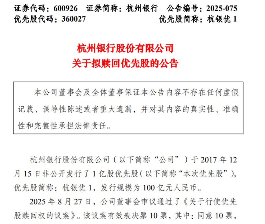 此前宁波银行发布公告称,拟于2025年11月7日全额赎回1亿股非公开发行优先股,赎回规模达人民币100亿元。该优先股每股面值100元,代码为“140007”,简称“宁行优02”。