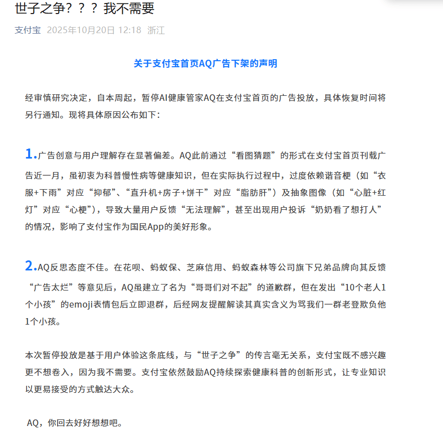 10月20日,支付宝发布《关于支付宝首页AQ广告下架的声明》。文中提到经审慎研究决定,自本周起,暂停AI健康管家AQ在支付宝首页的广告投放,具体恢复时间将另行通知。