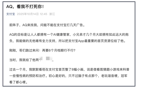 值得注意的是,10月14日中午,支付宝官方微信一篇自带“火气”的推文“炸翻”朋友圈,文中直接痛批自家的AI健康应用AQ。