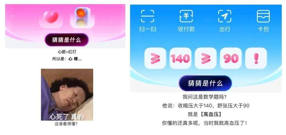 更离谱的是,AQ还玩起了抽象风。比如用“心脏+红灯”暗示“心梗”,用数字“140/90”表示高血压。