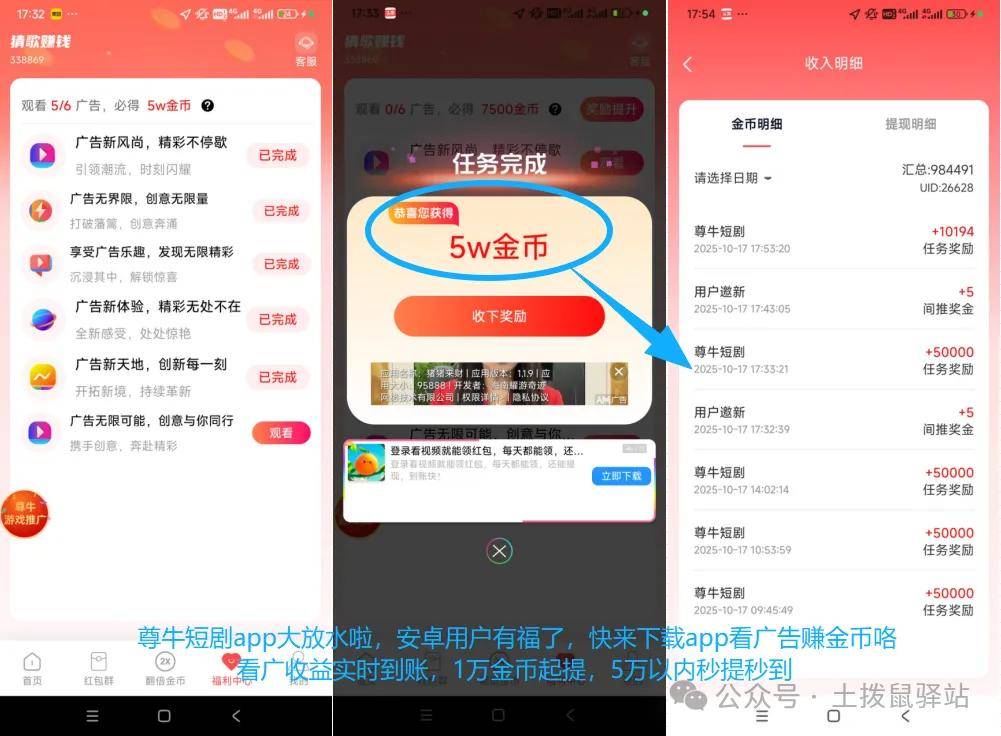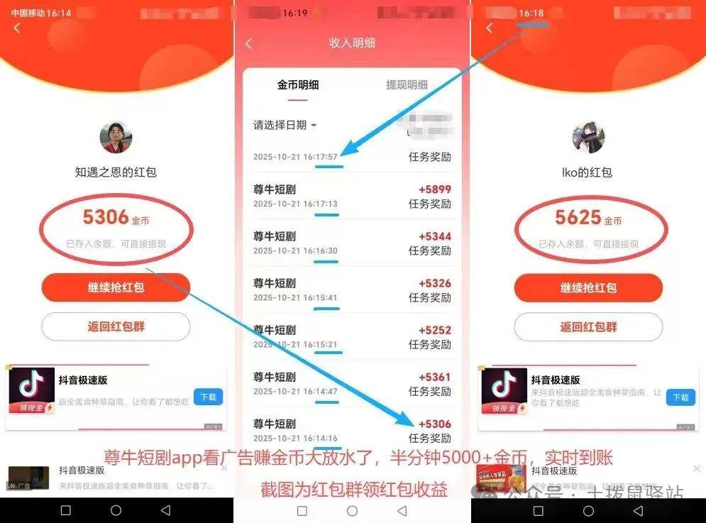 友梦联盟旗下的尊牛短剧看广赚金币大放水啦