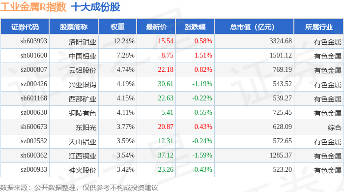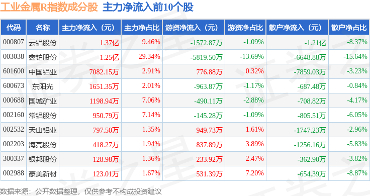 资金流向方面,工业金属R(480043)指数成份股当日主力资金净流出合计18.76亿元,游资资金净流入合计5.85亿元,散户资金净流入合计12.91亿元。成份股资金流向详情见下表: