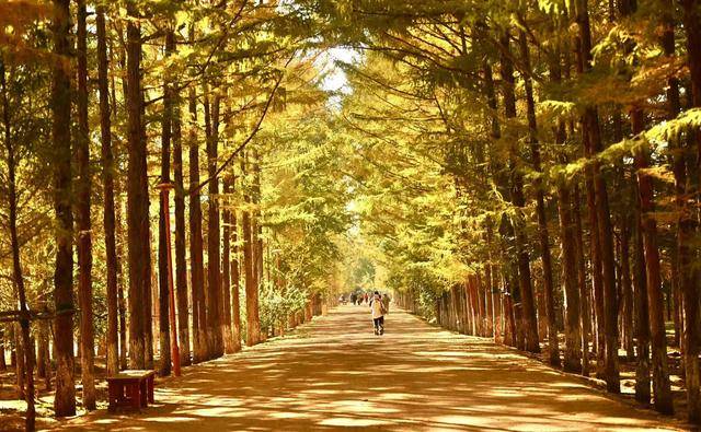 为追求纵深感构图,可站在“黄金大道”中间,将手机镜头微微上扬,在确保清晰度的前提下尽量拉大焦距,以增加树木的“压缩感”,拍出步道延伸向园区的纵深感,凸显“黄金大道”的绵长与幽静。