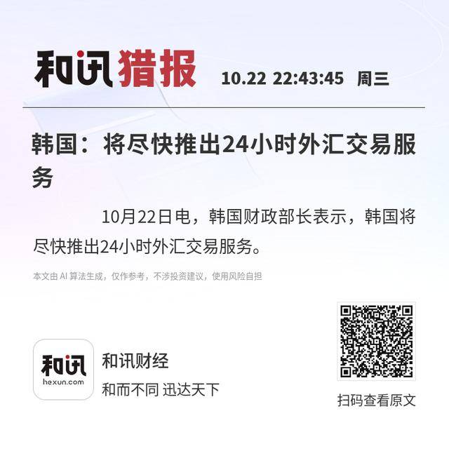 10月22日电,韩国财政部长表示,韩国将尽快推出24小时外汇交易服务。