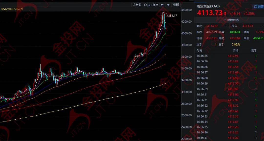 隔夜,现货黄金收盘下跌0.64%,报4098.35美元,金价盘中出现157美元的惊人波动幅度。今日欧市盘中,黄金窄幅震荡,目前在4118美元附近徘徊。