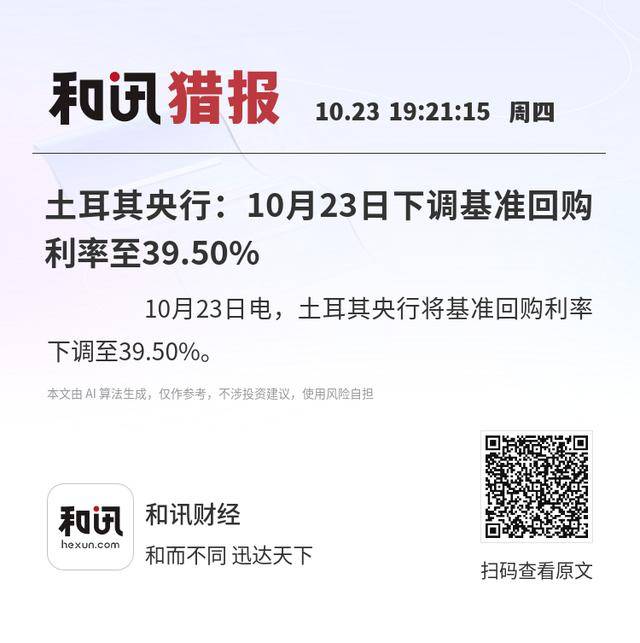 10月23日电,土耳其央行将基准回购利率下调至39.50%。