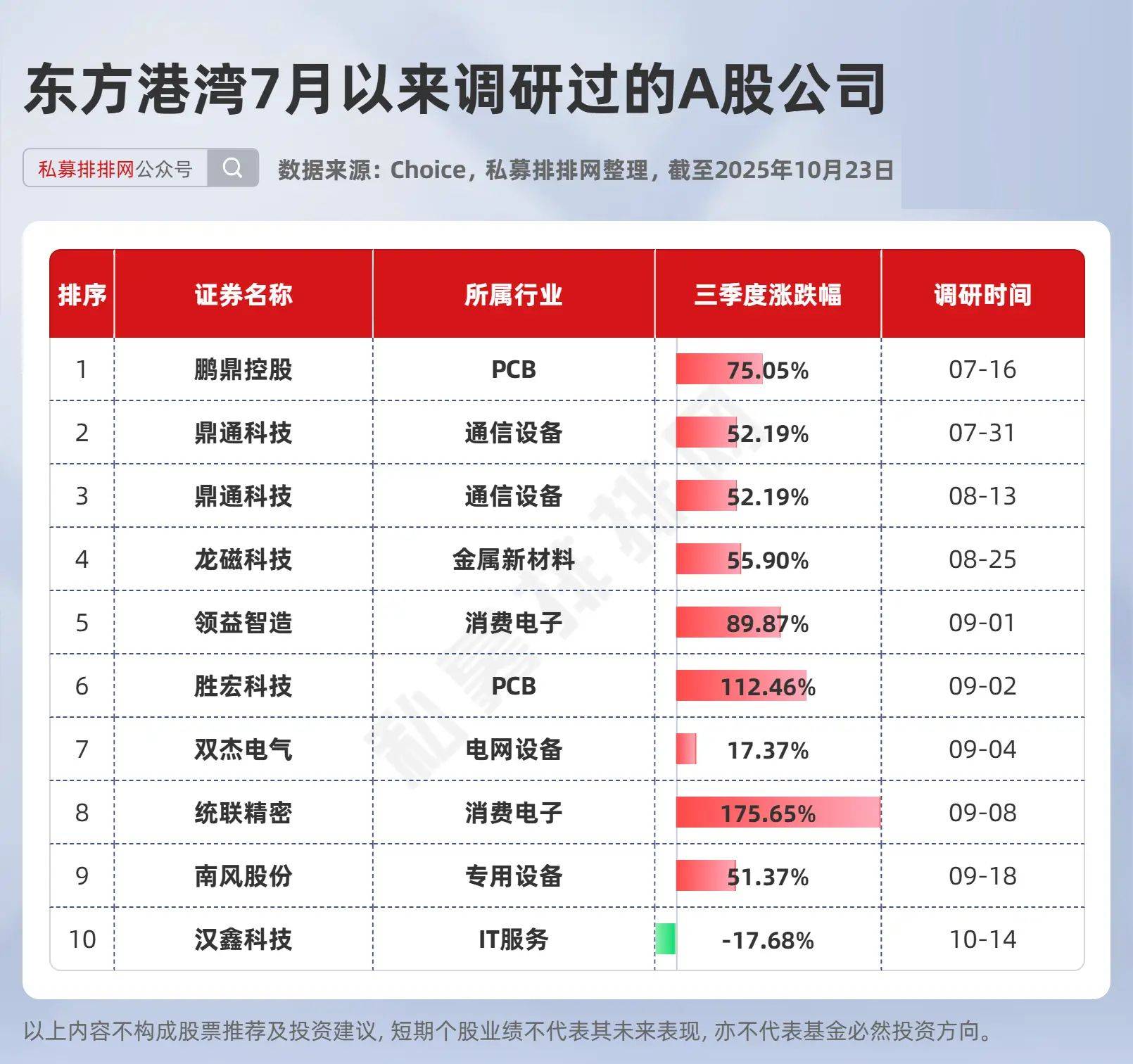 虽然,但斌的持仓主要集中在美股科技股上。但其掌舵的东方港湾也有关注A股的投资机会。笔者根据A股公司披露的调研公告统计,今年7月以来,东方港湾共调研了9家A股公司,均为科技类公司且多数公司股价在三季度表现亮眼。其中,鼎通科技被调研了2次。