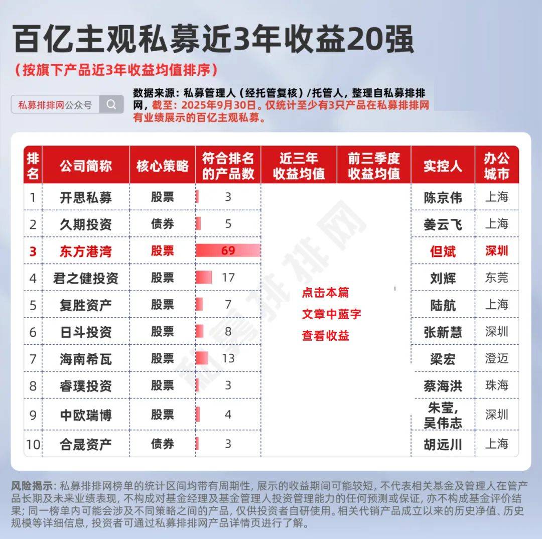 根据私募排排网数据,截至2025年9月末,东方港湾旗下产品近三年收益均值超***%,在百亿主观私募中位居第3名,前2名均为今年新晋的百亿私募。值得一提的是,但斌执掌的东方港湾曾在2023年、2024年连续2个年度夺得百亿私募冠军。