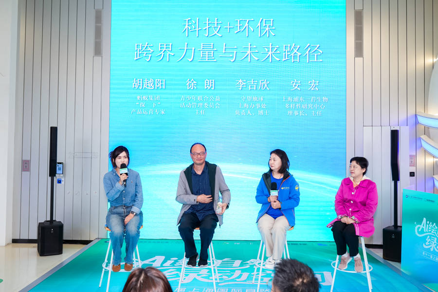在随后的环保对话环节,蚂蚁集团“探一下”产品运营专家胡越阳、青少年联合公益活动管理委员会主任徐朗、守望地球上海办事处负责人李吉欣博士、上海浦东一荇生物多样性研究中心理事长安宏等四位嘉宾齐聚一堂。他们分别从技术创新、青年力量、国际经验与本土实践等多元视角出发,共同探讨“科技+环保”融合发展的新路径与广阔前景。