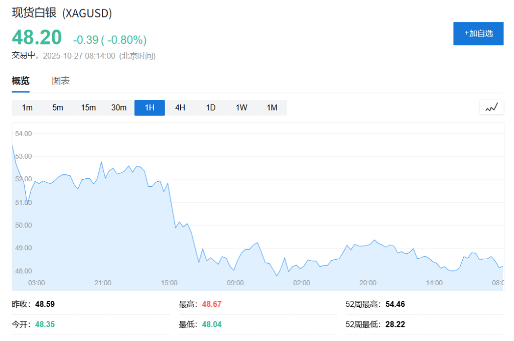 避险资产现货黄金跌超1%至每盎司4069美元。现货白银跌0.8%。