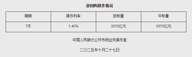 中新网10月27日电 据央行网站消息,2025年10月27日中国人民银行以固定利率、数量招标方式开展了3373亿元7天期逆回购操作。具体情况如下: