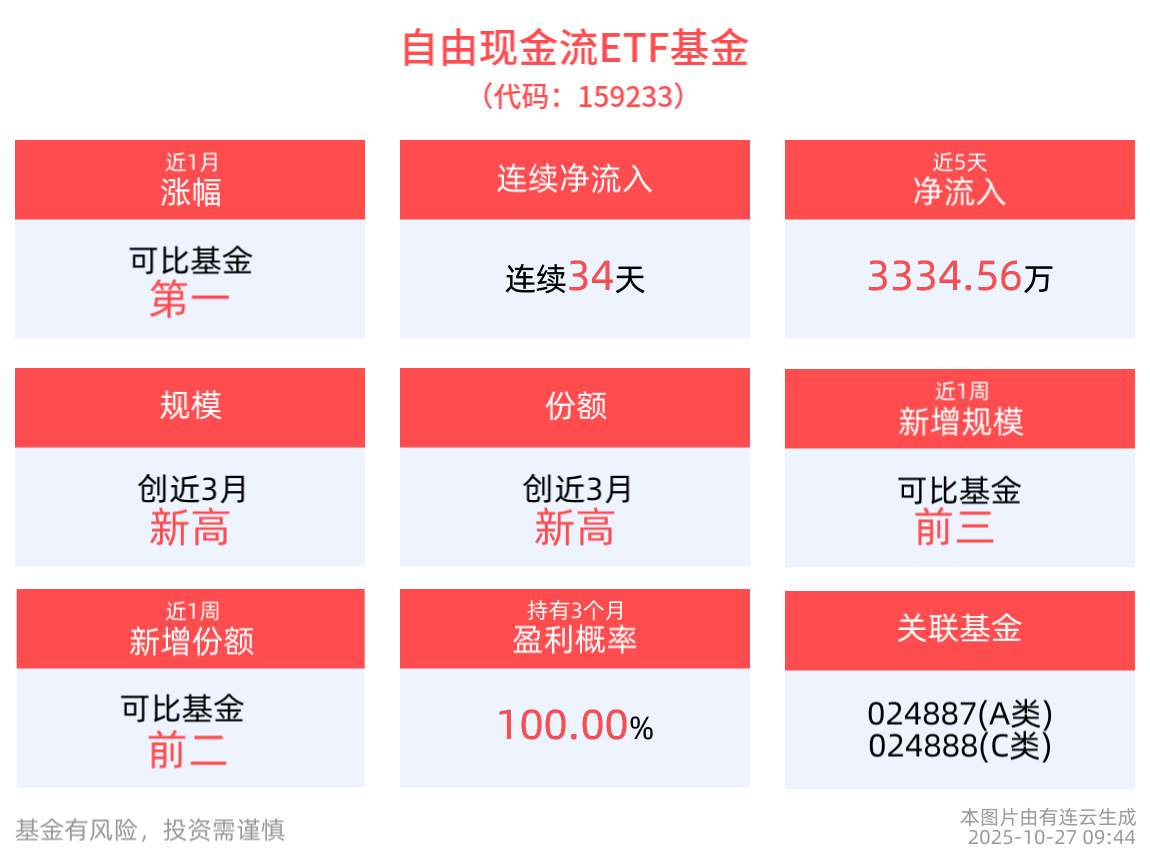 规模方面,自由现金流ETF基金最新规模达3.41亿元,创近3月新高。