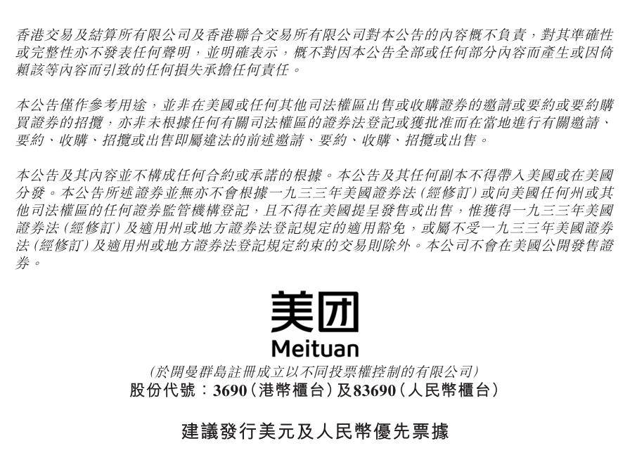 美团表示,票据的本金总额、利率、付款日期及若干其他条款和条件尚未厘定。