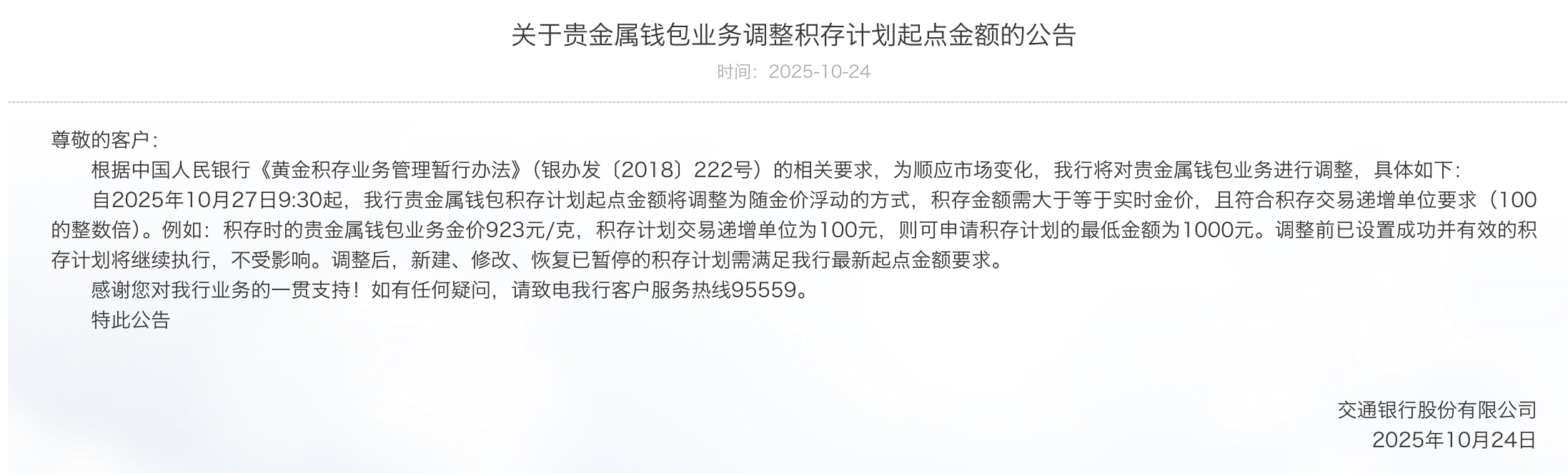 交通银行近日公告称,为顺应市场变化,交行将对贵金属钱包业务进行调整。自2025年10月27日9:30起,交行贵金属钱包积存计划起点金额将调整为随金价浮动的方式,积存金额需大于等于实时金价,且符合积存交易递增单位要求(100的整数倍)。