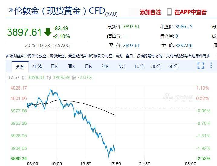 28日,现货黄金跌破3900美元/盎司,为10月6日以来首次,日内跌幅扩大至2%。截至17时58分,伦敦金现报3897.61美元/盎司。近6个交易日,现货黄金有5个交易日录得下跌。
