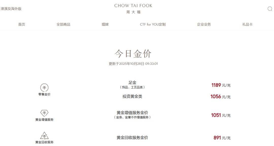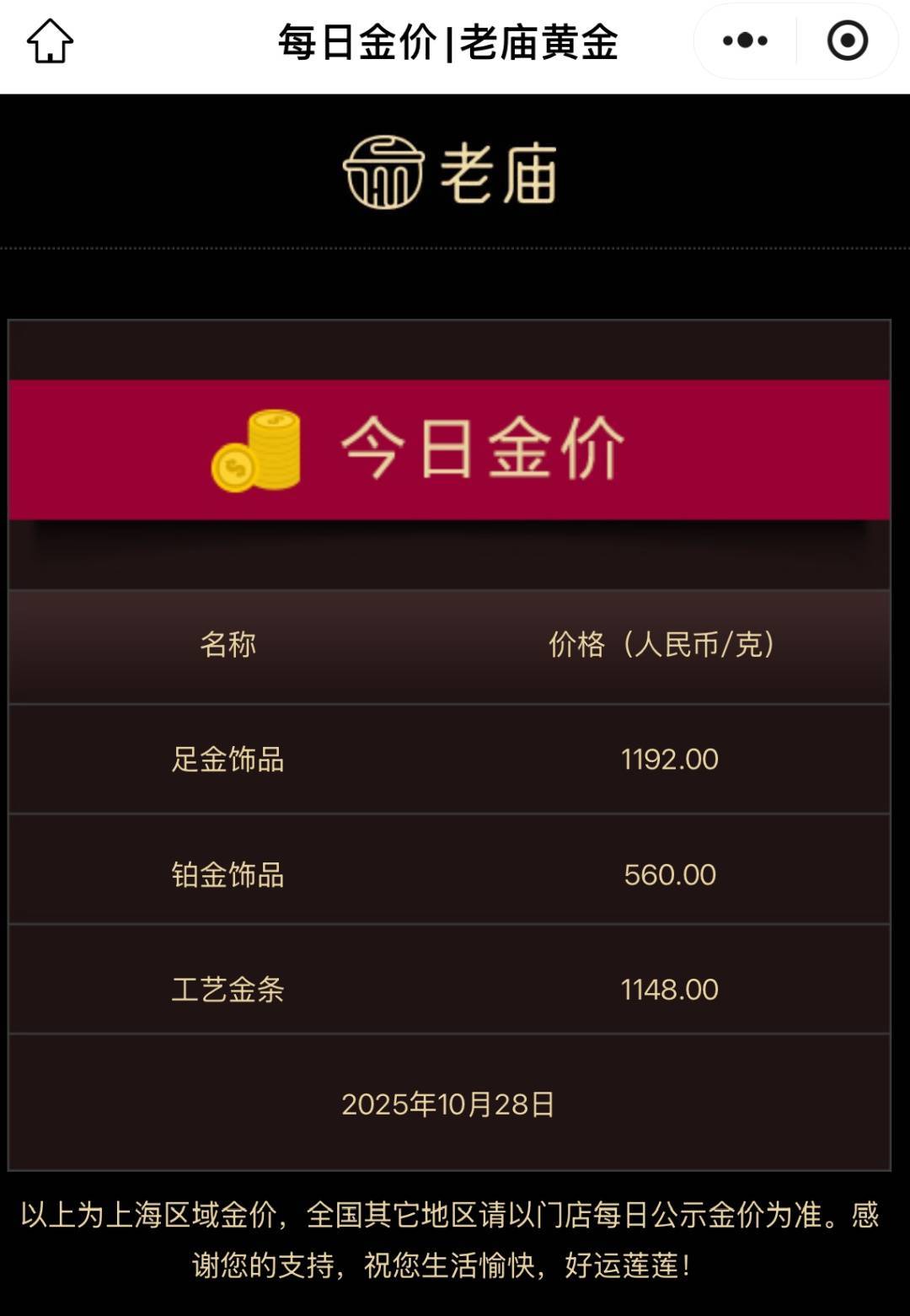 查询发现,老庙黄金报价1192元/克,较前一日下跌28元/克;周生生报价1199元/克,较前一日下跌24元/克;周大福报价1198元,单日下跌25元;老凤祥报价1202元/克,单日下跌18元/克。
