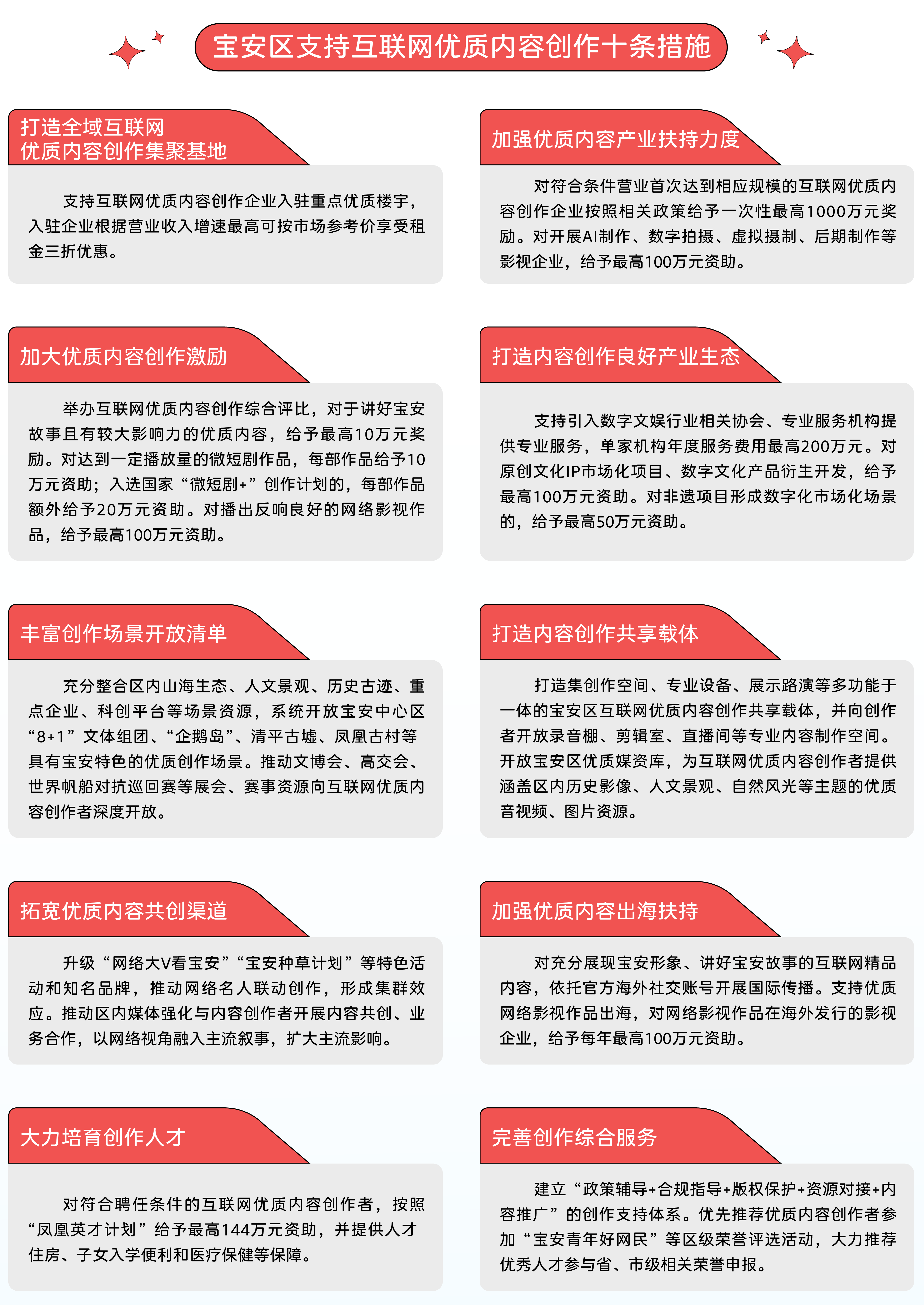 为加大优质内容创作激励,宝安将举办互联网优质内容创作综合评比,对于讲好宝安故事且有较大影响力的优质内容,给予最高10万元奖励。对达到一定播放量的微短剧,每部给予10万元资助;入选国家“微短剧+”创作计划的,每部作品额外给予20万元资助。对播出反响良好的网络影视作品,给予最高100万元资助。