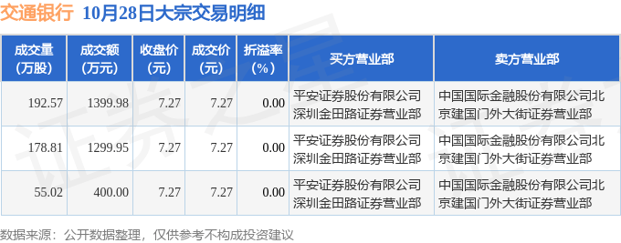 证券之星消息,10月28日交通银行发生大宗交易,交易数据如下: