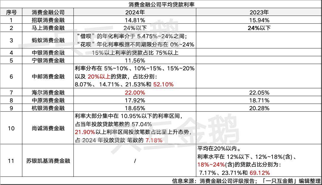 「一只互金鹅」根据部分消费金融公司评级报告,整理了各家的产品利率。