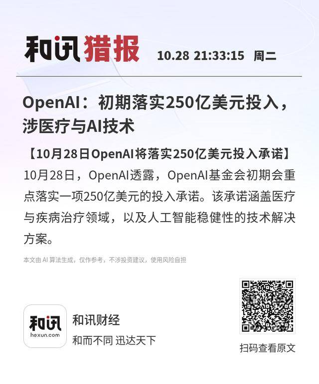 【10月28日OpenAI将落实250亿美元投入承诺】10月28日,OpenAI透露,OpenAI基金会初期会重点落实一项250亿美元的投入承诺。该承诺涵盖医疗与疾病治疗领域,以及人工智能稳健性的技术解决方案。
