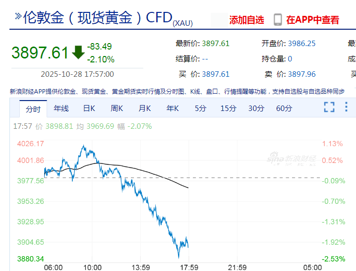 28日,现货黄金一度跌破3900美元/盎司,为近期新低。