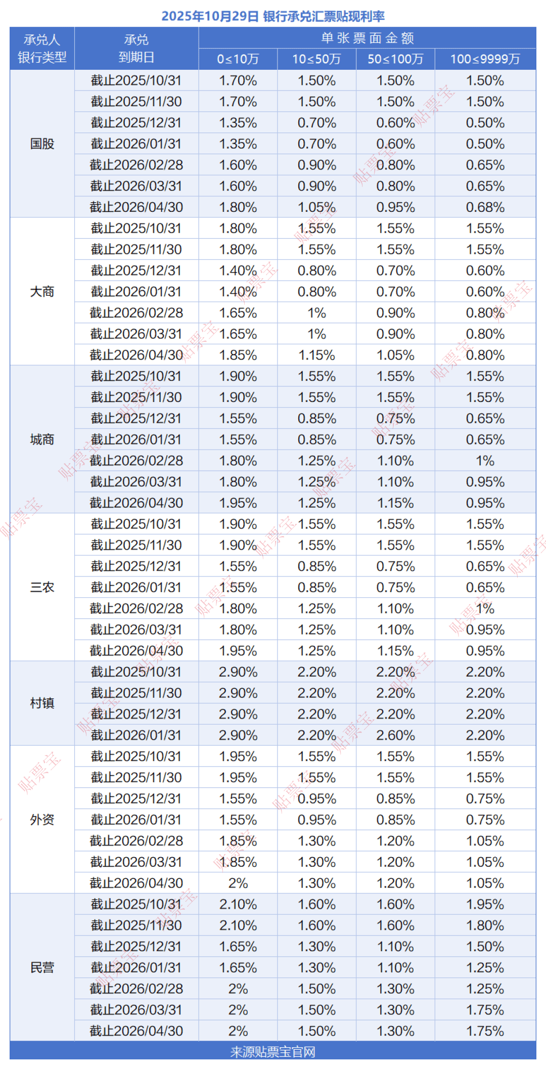 2025年10月29日承兑汇票贴现利率公示