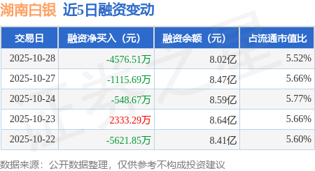 证券之星消息,10月28日,湖南白银(002716)融资买入6125.32万元,融资偿还1.07亿元,融资净卖出4576.51万元,融资余额8.02亿元。
