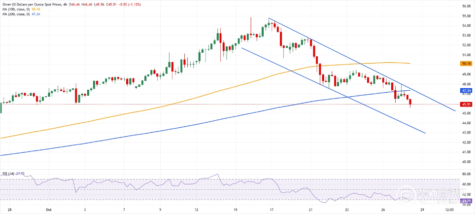 【华通白银网10月29日讯】•在投机见顶后,市场趋于正常化,银价跌向一个月低点。