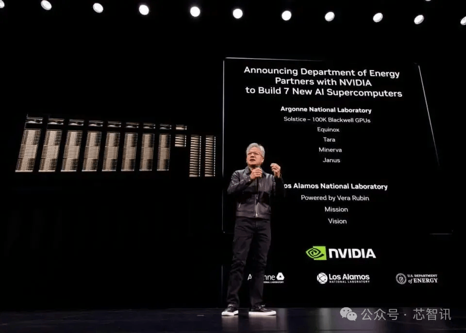黄仁勋宣布英伟达已与美国能源部达成协议,将再建设7台超级计算机。这些超算将使用Blackwell和下一代Vera Rubin架构芯片,分别配置在阿贡国家实验室和洛斯阿拉莫斯国家实验室。