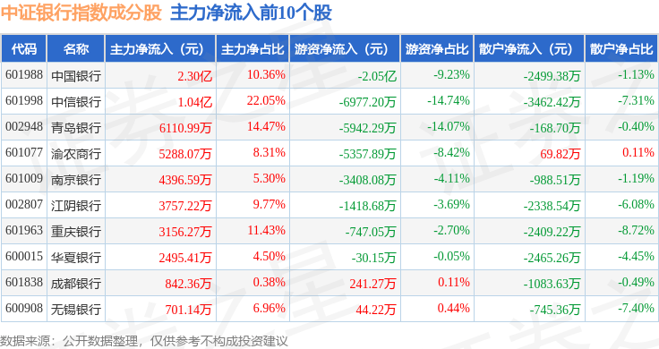资金流向方面,中证银行(399986)指数成份股当日主力资金净流出合计24.76亿元,游资资金净流入合计2.93亿元,散户资金净流入合计21.83亿元。成份股资金流向详情见下表: