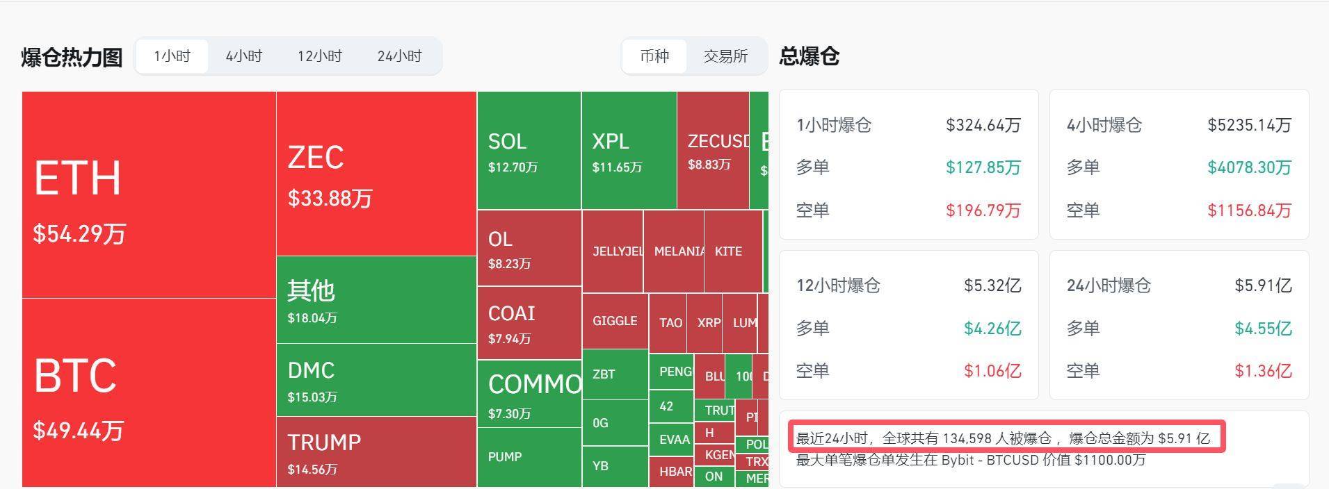 coinglass数据显示,24小时内,加密货币全网合约爆仓5.91亿美元,爆仓人数达到13.45万人。