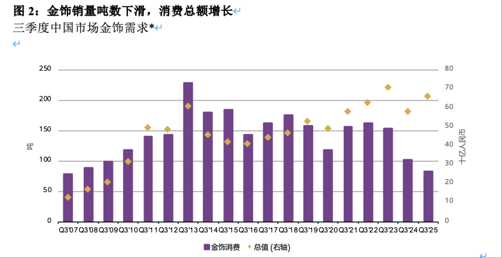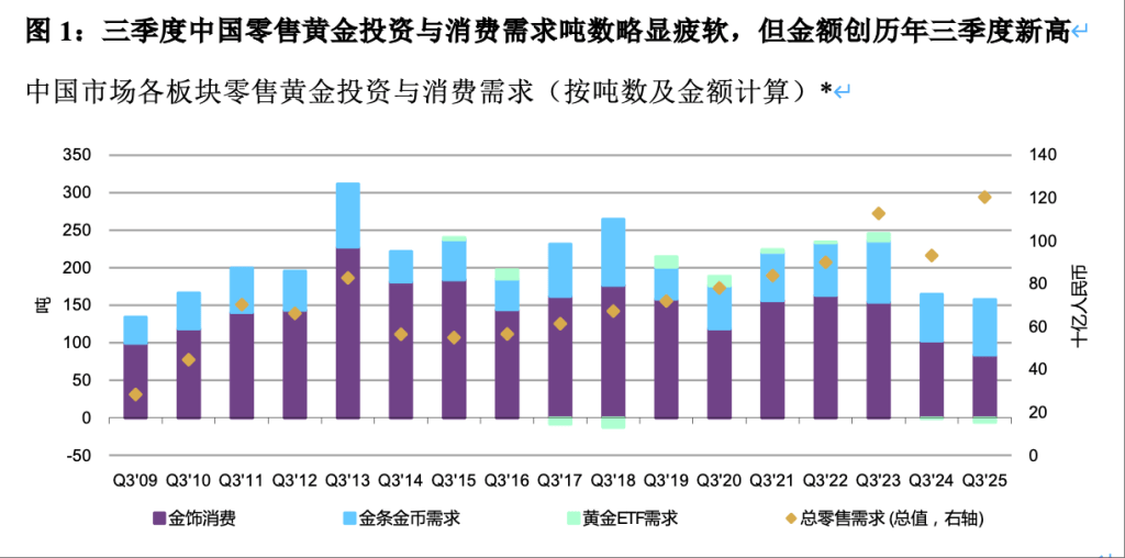 数据显示,2025年三季度,中国市场零售黄金投资与消费需求(包括金饰、金条、金币及黄金ETF)达152吨,较上年同比下降7%,季度环比下滑38%。这也是自2009年以来最疲弱的三季度需求表现。