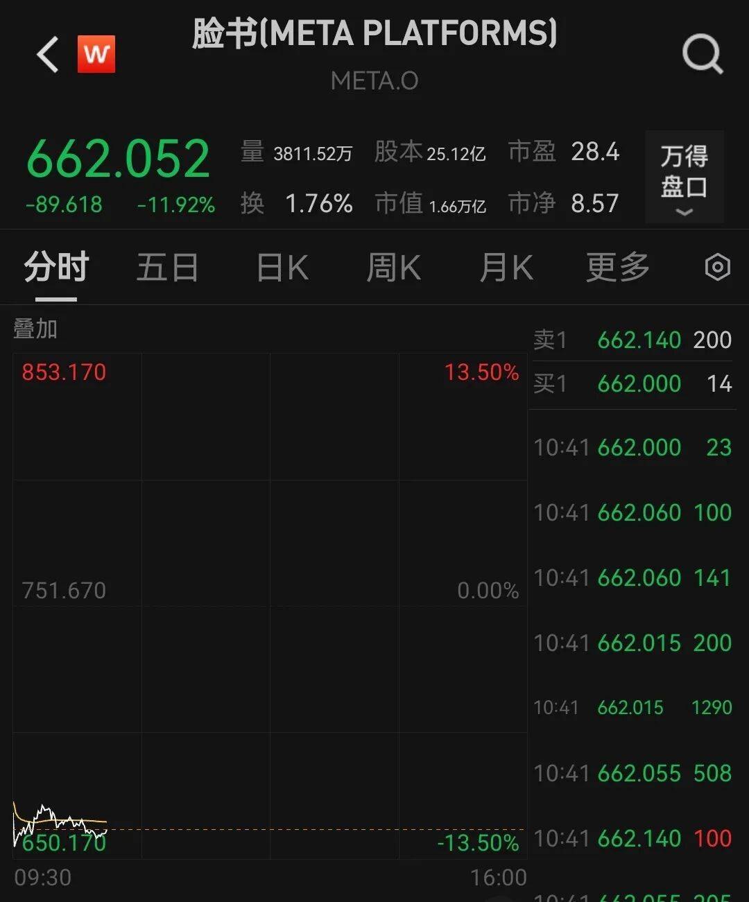 当地时间10月30日,Meta股价开盘一度下跌13.5%,创下2024年4月以来最大跌幅。截至发稿,其股价报662.052美元,市值约为1.66万亿美元,当日市值蒸发了约2260亿美元(约合人民币16000亿元)。