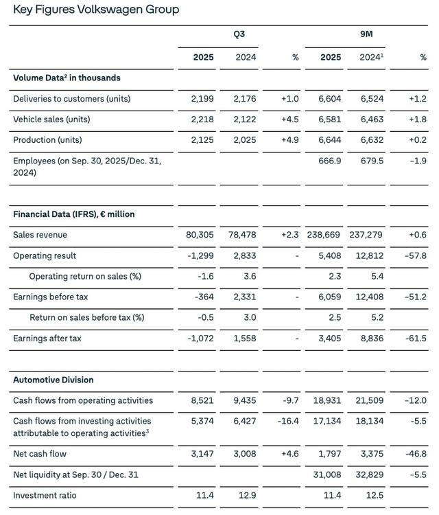 大众集团首席财务官阿诺·安特利茨表示,与上年同期相比,业绩明显走弱主要是受低利润率的电动车产量增加,以及合计75亿欧元的额外负担影响,其中包括美国进口关税、旗下品牌保时捷的产品战略调整和相关商誉及企业价值减记等。若剔除相关费用,集团前三季度利润率为5.4%。