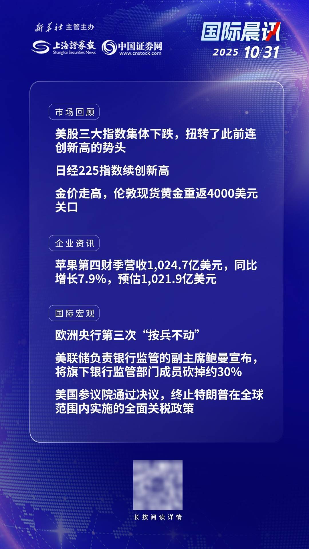 美东时间周四,美股三大指数集体下跌,扭转了此前连创新高的势头。日经225指数续创新高。金价走高,伦敦现货黄金重返4000美元关口。苹果第四财季营收1,024.7亿美元,同比增长7.9%,预估1,021.9亿美元。欧洲央行第三次“按兵不动”。美国参议院通过决议,终止特朗普在全球范围内实施的全面关税政策。