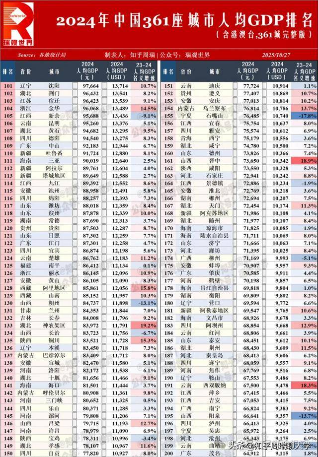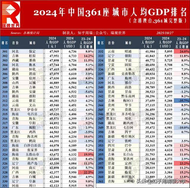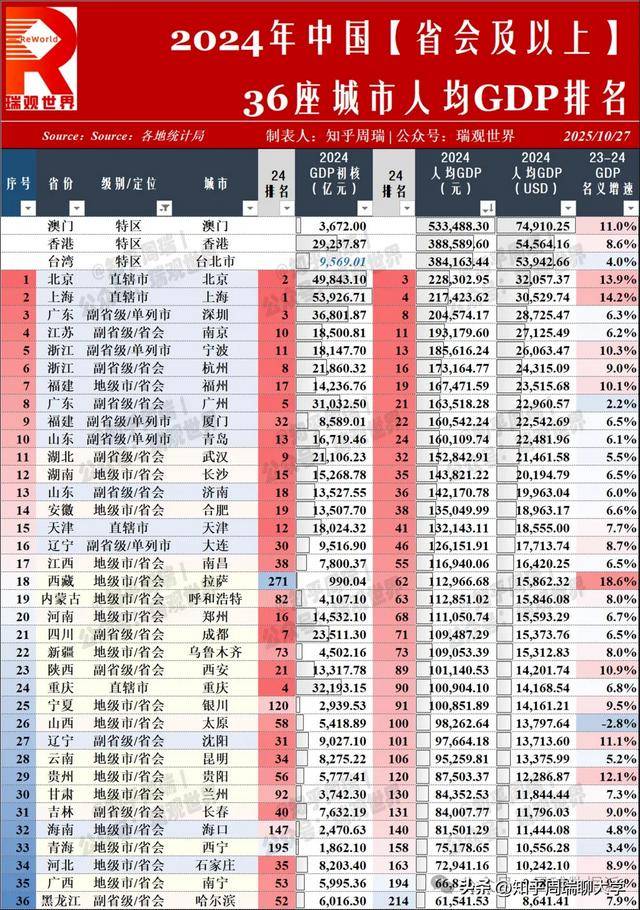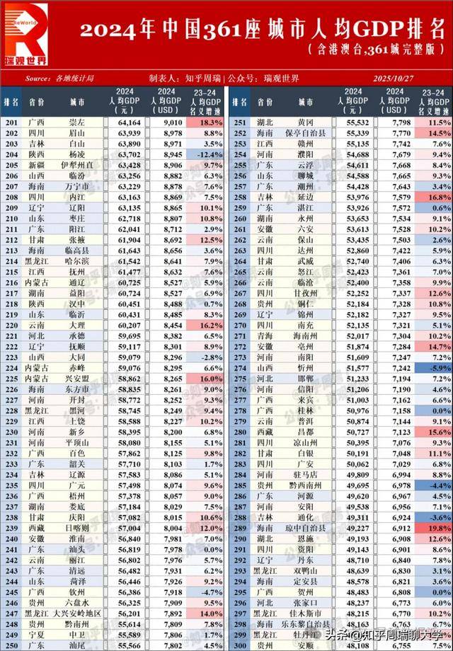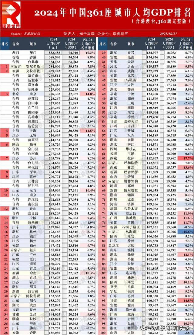 当澳门以 74,910 美元的人均 GDP 雄踞中国 361 城榜首,香港、台北紧随其后时,这份 2024 年中国城市人均 GDP 排名,既是经济实力的 “成绩单”,更是区域发展逻辑的 “透视镜”。人均 GDP 作为衡量经济发展水平与居民富裕程度的核心指标,其内涵远不止 “数字高低”—— 它是产业结构、资源禀赋、政策导向的综合投射,更是一个城市在全国乃至全球经济网络中地位的直观体现。在这份涵盖港澳台的完整榜单中,每一组数据的升降,都藏着中国经济 “均衡与极化”“追赶与领跑” 的深层叙事。