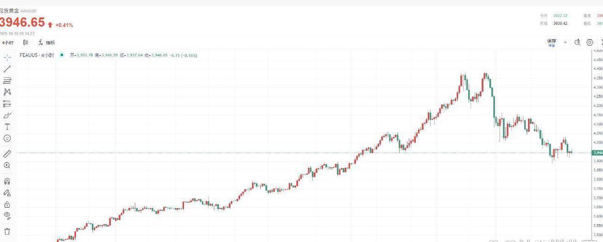 让我们首先聚焦于水贝市场的实时数据。10月30日上午9点15分,水贝黄金交易所的金价牌上赫然显示:黄金Au销售价为901.24元/克,相较昨日已下跌近1元;白银Ag的价格仅为10.85元/克,铂金Pt更是跌至359.31元/克。与国际市场对比,现货黄金价格如瀑布般从3920美元的高点一落千丈,4小时K线图呈现出惊险刺激的过山车形态。