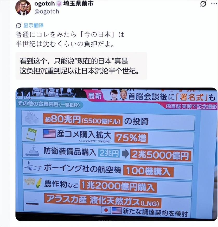 最近,美国总统特朗普访问日本,刚上台的日本首相高市早苗的一系列表现引发日本舆论争议。尤其是美日达成的5500亿美元的对美投资协议,引发日本国内强烈争议。看协议内容就知道日本人为何大破防。