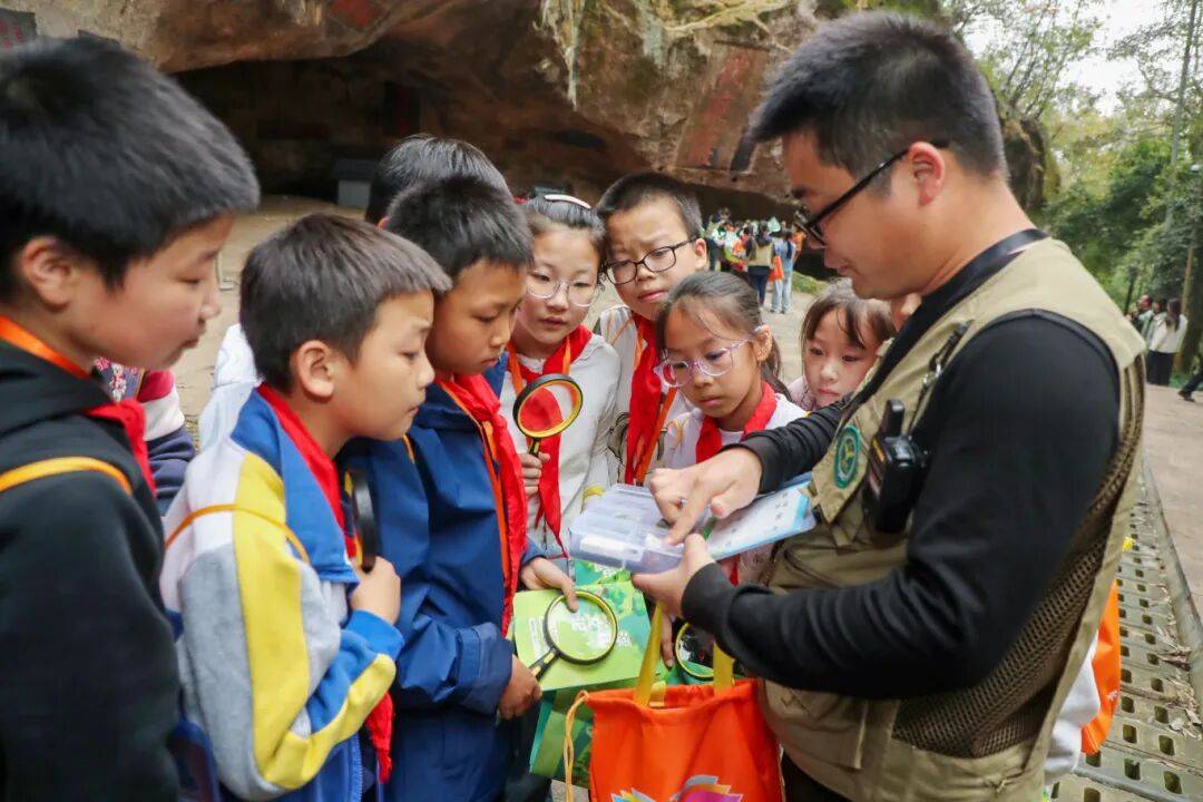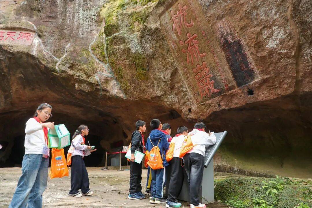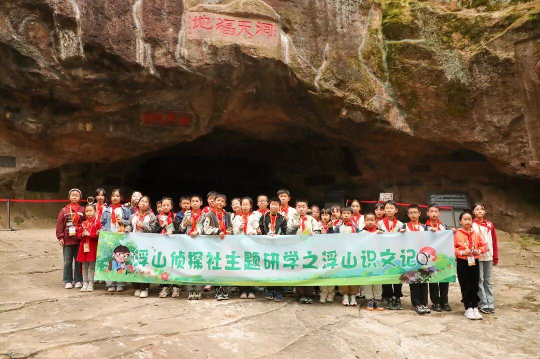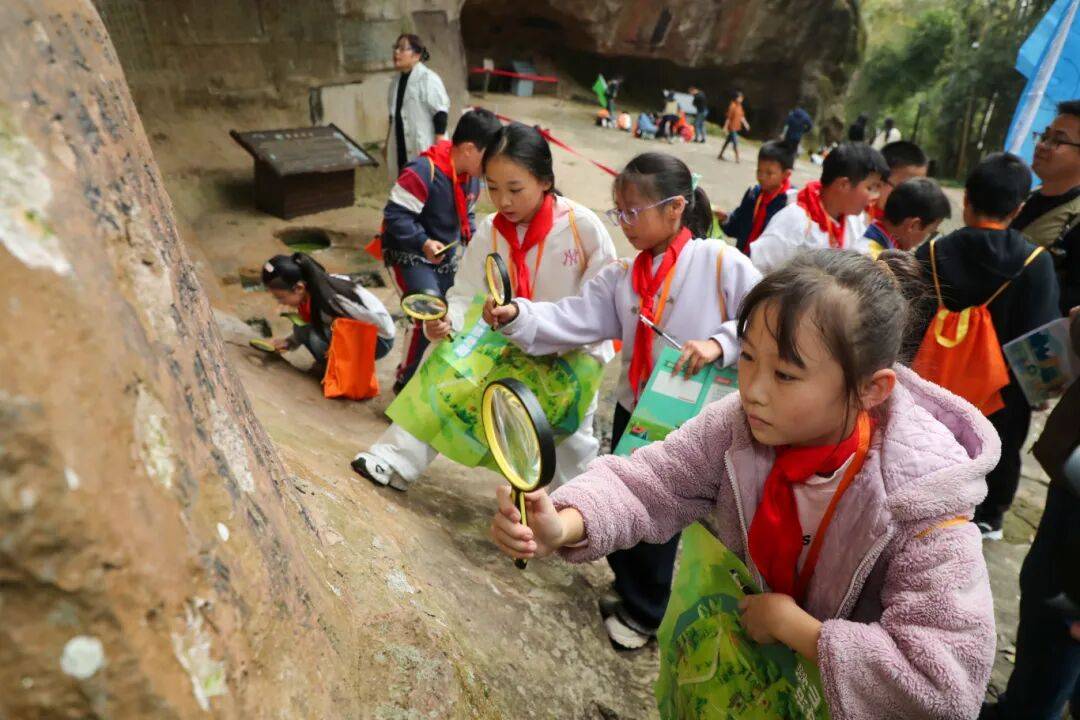 浮山,素有“文山”之美誉,现存483块摩崖石刻,与黄山、九华山、天柱山、琅琊山等历史名山并驾齐驱。10月31日下午,嘉宾们携手浮山镇双花小学孩子们一同登上浮山,开展研学课程实地体验。“站在摩崖石刻前,那些镌刻在巨石上的文字,有的比课本还要大。凝视这些字迹,我似穿越时空,与古人进行了一场无声的‘对话’。”双花小学五年级学生黄雨韩手持放大镜,仔细端详着岩石上镌刻的字迹后说道。
