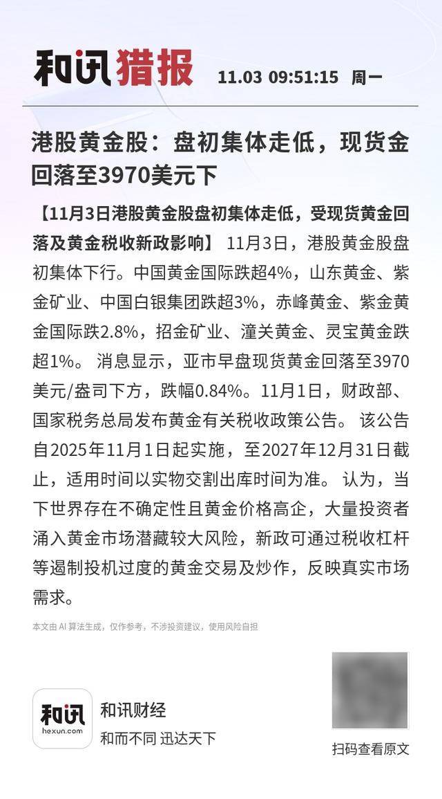【11月3日港股黄金股盘初集体走低,受现货黄金回落及黄金税收新政影响】11月3日,港股黄金股盘初集体下行。中国黄金国际跌超4%,山东黄金、紫金矿业、中国白银集团跌超3%,赤峰黄金、紫金黄金国际跌2.8%,招金矿业、潼关黄金、灵宝黄金跌超1%。 消息显示,亚市早盘现货黄金回落至3970美元/盎司下方,跌幅0.84%。11月1日,财政部、国家税务总局发布黄金有关税收政策公告。 该公告自2025年11月1日起实施,至2027年12月31日截止,适用时间以实物交割出库时间为准。 认为,当下世界存在不确定性且黄金价格高企,大量投资者涌入黄金市场潜藏较大风险,新政可通过税收杠杆等遏制投机过度的黄金交易及炒作,反映真实市场需求。