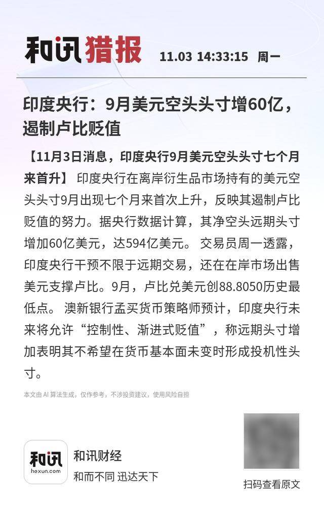 【11月3日消息,印度央行9月美元空头头寸七个月来首升】印度央行在离岸衍生品市场持有的美元空头头寸9月出现七个月来首次上升,反映其遏制卢比贬值的努力。据央行数据计算,其净空头远期头寸增加60亿美元,达594亿美元。 交易员周一透露,印度央行干预不限于远期交易,还在在岸市场出售美元支撑卢比。9月,卢比兑美元创88.8050历史最低点。 澳新银行孟买货币策略师预计,印度央行未来将允许“控制性、渐进式贬值”,称远期头寸增加表明其不希望在货币基本面未变时形成投机性头寸。