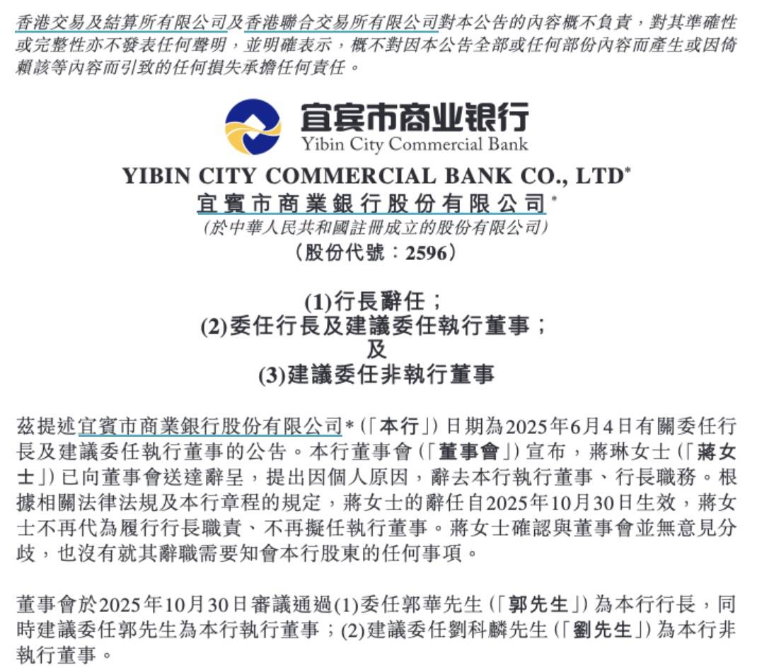 日前,宜宾市商业银行(下称“宜宾银行”)发布公告称,蒋琳因个人原因辞去该行执行董事、行长职务,辞任自当日起生效。与此同时,宜宾银行董事会审议通过委任郭华为该行新任行长,并建议委任其为执行董事。