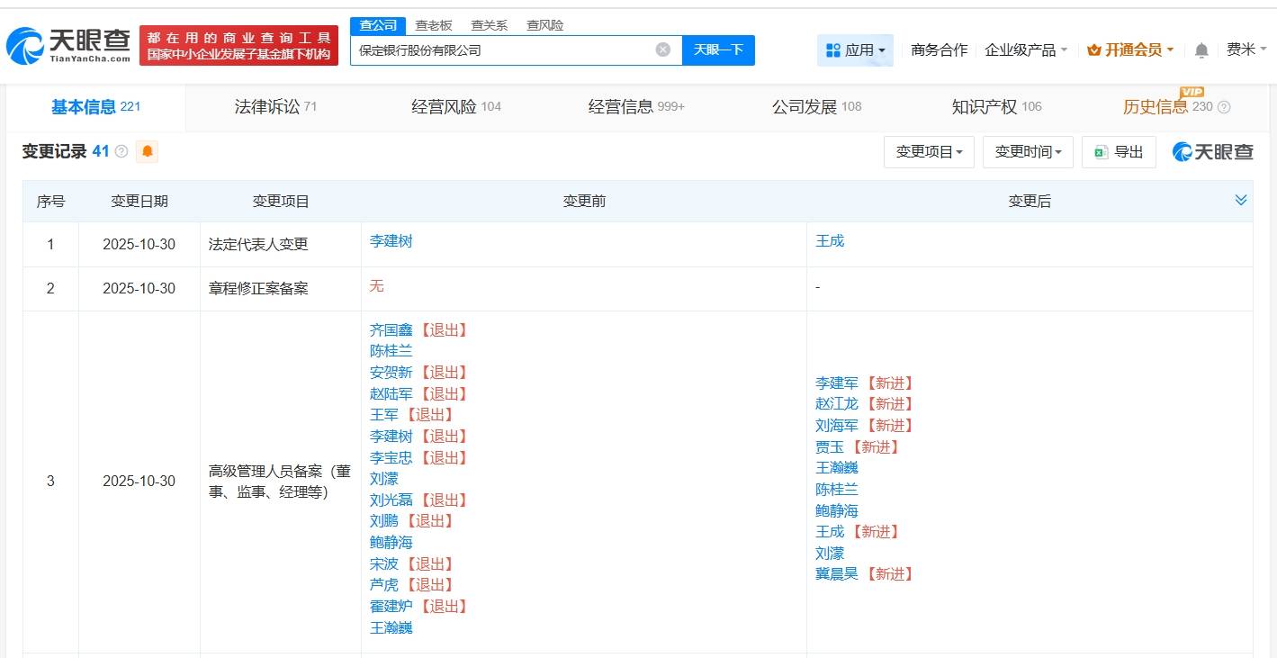 雷达财经讯,天眼查工商信息显示,近日,保定银行股份有限公司发生工商变更,李建树卸任法定代表人、董事长,由王成接任,同时多位主要人员发生变更。